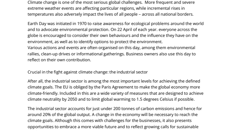 Earth Day emphasises the importance of climate protection for the whole world. On 22 April of each year. everyone is encouraged to consider their own behaviours and the influence they have on the environment. But natural disasters and their impacts can only be averted with concerted action on several fronts. Especially in the industrial sector