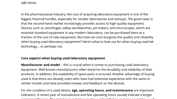 In the pharmaceutical industry, the cost of acquiring laboratory equipment is one of the biggest financial hurdles, especially for smaller laboratories and startups. The good news is that the second-hand market increasingly provides access to high-quality equipment. Devices such as centrifuges, safety workbenches, pH meters, and microscopes, which are essential standard equipment in any modern laboratory, can be purchased there at a fraction of the cost of new equipment. But how can one recognise the quality and reliability when buying used laboratory equipment? Here's what to look out for when buying used lab technology... or perhaps not.