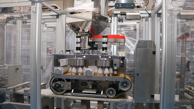 While this is taking place, the tablets are prepared. They are carefully transported over vibrating plates or surrounding belts to prevent them becoming damaged. Any capsules stuck together are separated using brushes. The flow of tablets has to be isolated to ensure that only one tablet is sorted into each pressed cell of the blister mould foil. A camera system is used to monitor whether exactly one tablet is present in each recess.