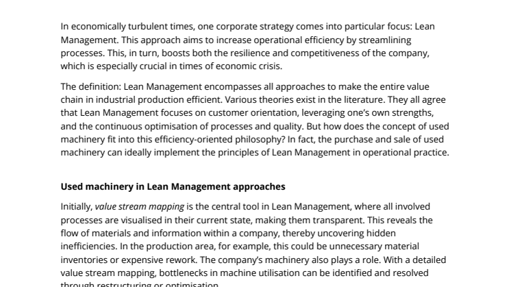 Lean Management is especially important in turbulent economic times as it boosts a company’s efficiency and competitiveness through process optimisation. Used machinery can also play a role in this strategy, offering a cost-effective way to promptly address production bottlenecks and optimise the machinery pool.